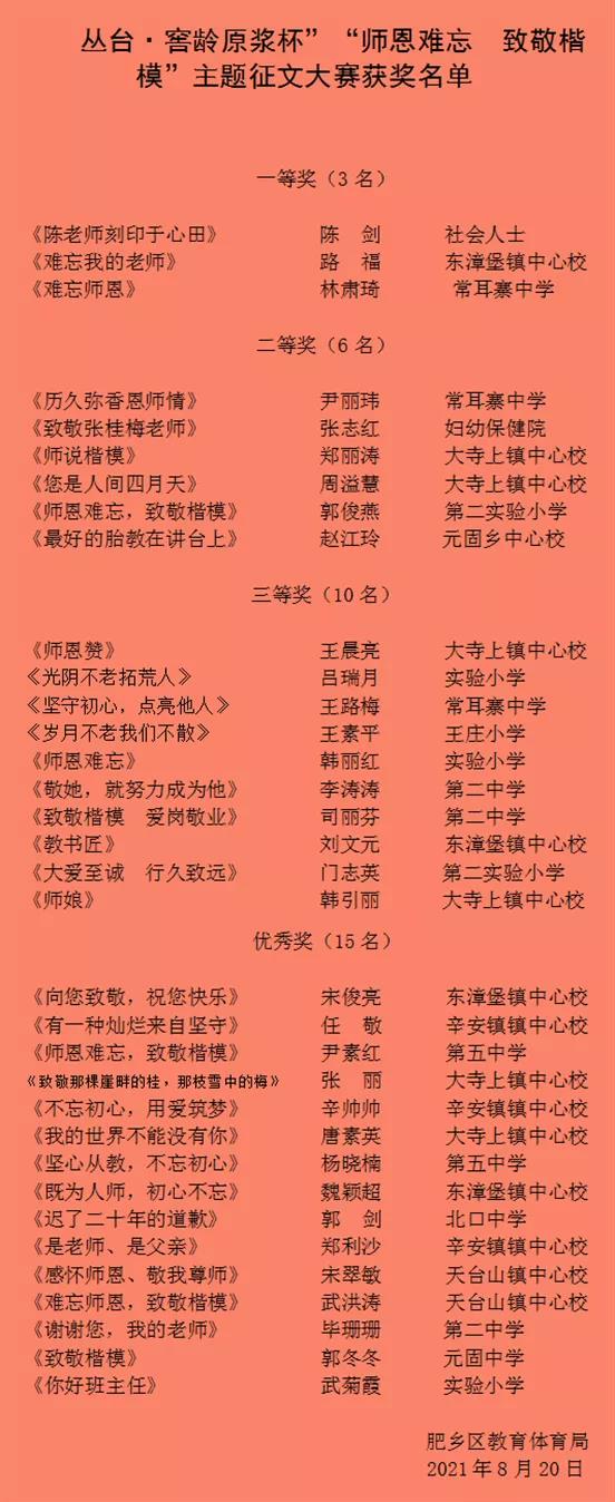 本次丛台•窖龄原浆杯“师恩难忘•致敬楷模”主题征文大赛活动得到了社会各界人士的鼎力支持,广大老师和文学爱好者积极报名,踊跃参与,共收到172件参赛作品。经大赛组委会初评、复评、终评,共评选出:一等奖3名,二等奖6名,三等奖10名,优秀奖15名。获奖作品构思巧妙,格调高雅,紧扣主题,讴歌时代楷模、礼赞教育精神,深情诠释了基层教育者的家国情怀,在开展向“时代楷模”张桂梅同志学习的同时,也积极推动了肥乡区师德师风建设,文化教育事业的繁荣发展。