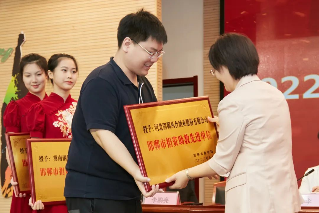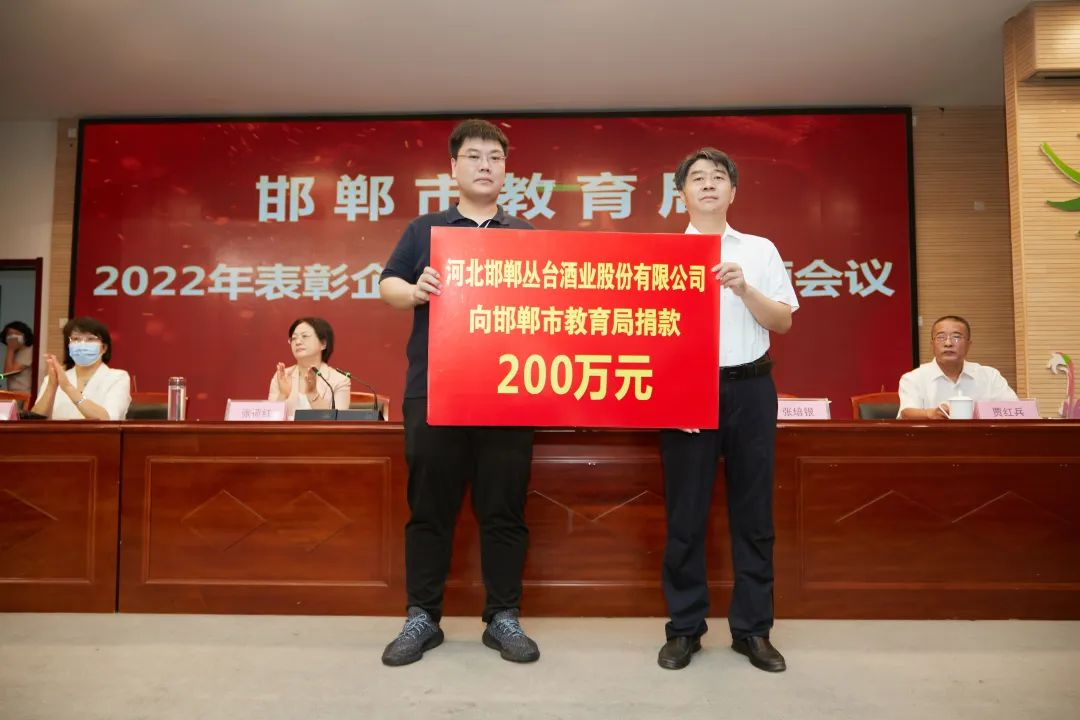 丛台酒业向邯郸市教育局捐款200万元,会上宣读了邯郸市教育局表彰决定,张荷红局长向丛台酒业颁发了捐资助教先进单位奖牌和捐资助教功臣荣誉证书。