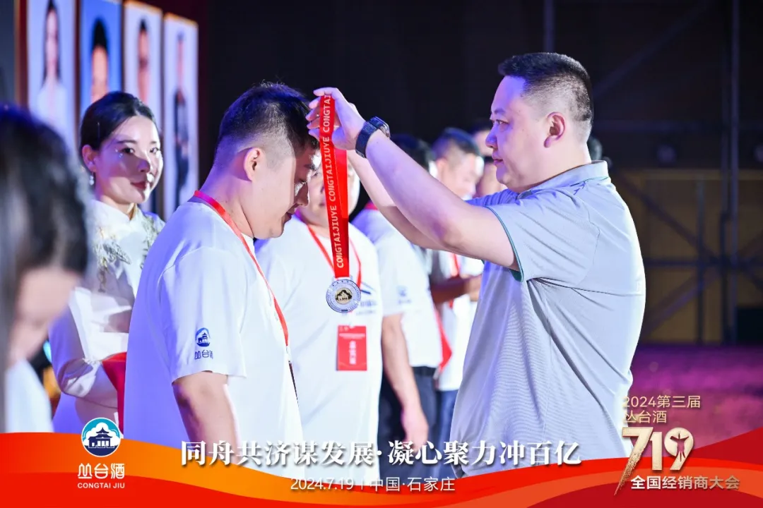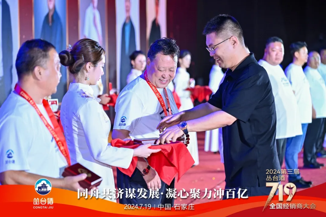 发言过后,大会对优秀经销商进行表彰,金牌赠予金色伙伴,象征着丛台酒与经销商同仁之间的真挚情谊,情比金坚。