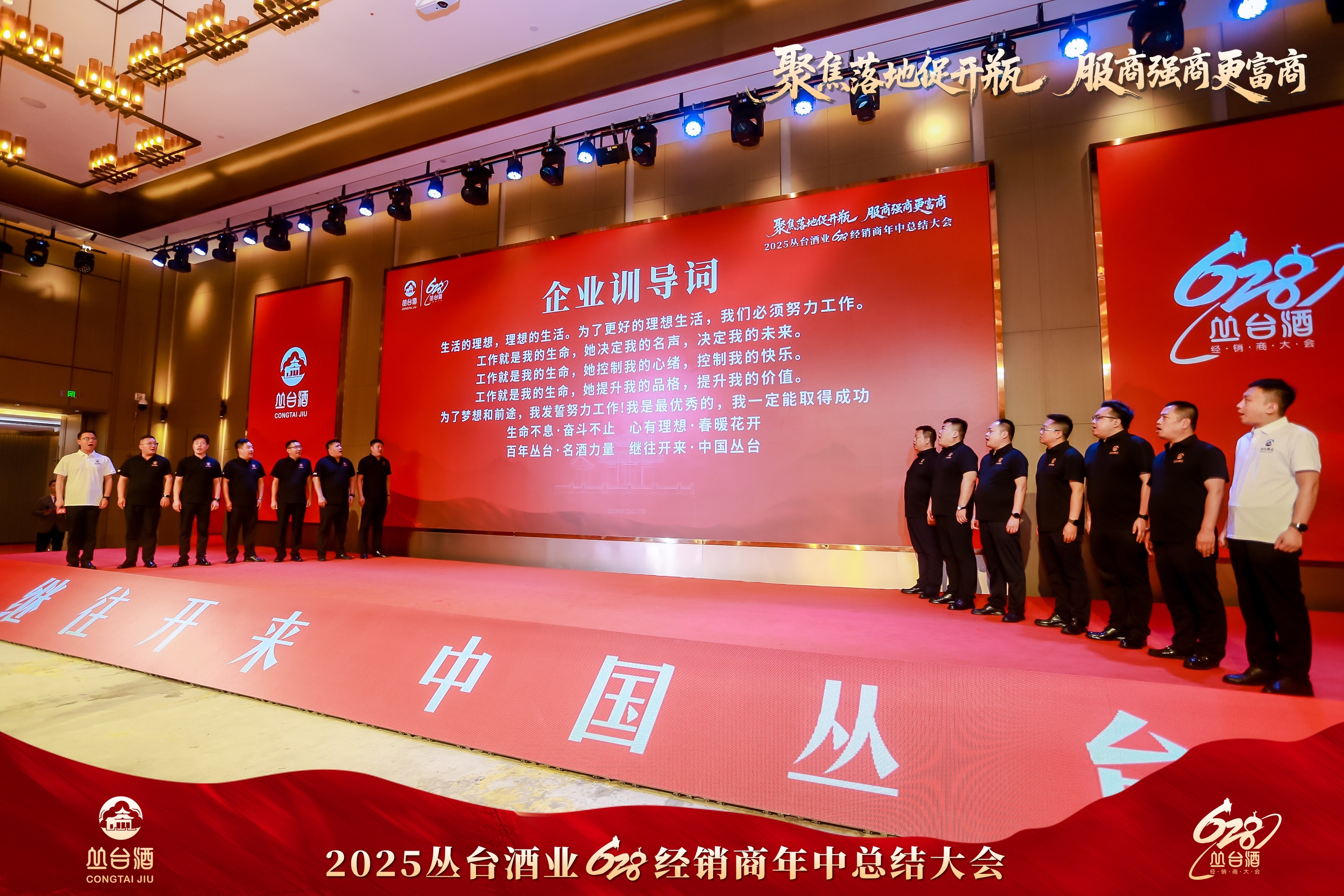 在企业训导词环节,丛台酒业营销有限公司二公司营销总监季磊带领团队领诵企业训导词,“快速决策,马上落实”“强商富商,共同发展”的理念响彻会场。随后,全体领导、嘉宾及经销商在酒店大堂拍摄纪念合影,定格这一重要时刻。